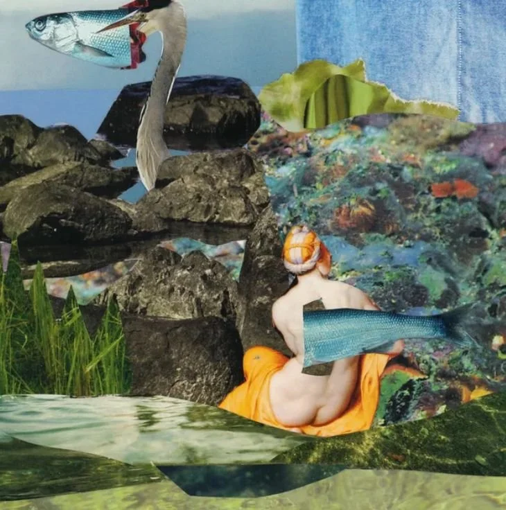 The pelican and the woman are the two main characters in this collage, and they look in different directions. Yet, they remain connected, as we understand from the fish they share. However, there’s a deep sorrow in the fact that the fish they share is torn apart. While the two characters appear to exist in the same habitat or the same lake, the collage visually and metaphorically separates them. The pelican is on the rocky terrain, while the woman is surrounded by coral.